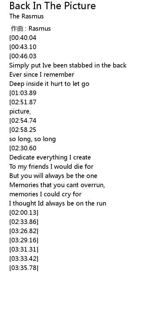 | [03:07.36][02:54.74][02:21.34][02:08.67][01:24.29][01:11.51] | Back in the picture |