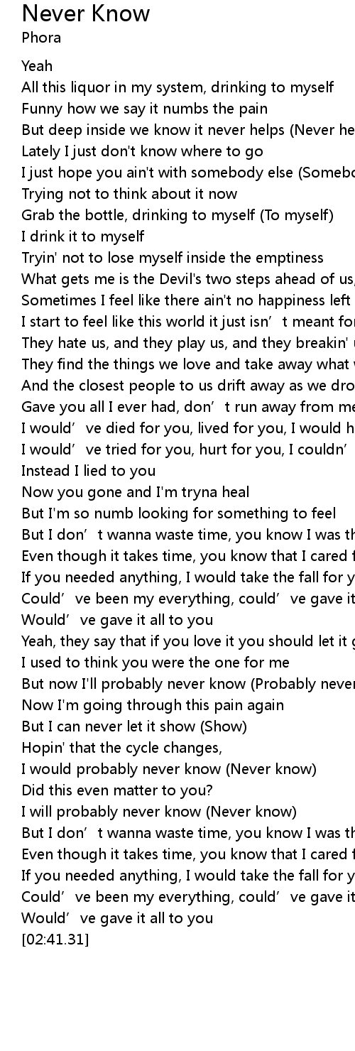 | [02:14.58] | I will probably never know (Never know) |