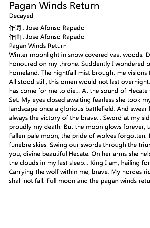 | Winter moonlight in snow covered vast woods. Drawing kingly winds dwelling honoured on my throne. Suddently I wondered on the highest cliffsedge of my homeland. The nightfall mist brought me visions from beyond the red horizon... All stood still, this omen would not last overnight. My name is whispered, time has come for me to die... At the sound of Hecate wings, behind the shades of Set. My eyes closed awaiting fearless she took my hand. To a white cold landscape once a glorious battlefield. And swear by my Celtic heart to grant always the victory of the brave... Sword at my side, ravens and owls chanting proudly my death. But the moon glows forever, taste the winds return so dark... Fallen pale moon, the pride of wolves forgotten. Leviathan tears bath us under funebre skies. Swing our swords through the triumphal breeze... My blood for you, divine beautiful Hecate. On her arms she held me high up towards. To touch the clouds in my last sleep... King I am, hailing for the eternal skies. Carrying the wolf within me, brave. My hordes riding like thunder, our flag shall not fall. Full moon and the pagan winds return. By fang revenge is ours! |