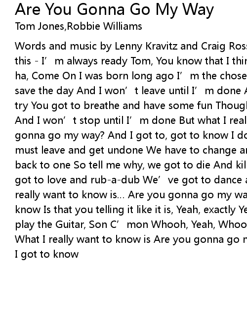 | Words and music by Lenny Kravitz and Craig Ross Hey Robbie are you ready for this I' m always ready Tom, You know that I think you were born ready Ha ha, Come On I was born long ago I' m the chosen, I' m the one I have come to save the day And I won' t leave until I' m done And that is why we' ve got to try You got to breathe and have some fun Though I' m not paid, I play this game And I won' t stop until I' m done But what I really want to know is Are you gonna go my way? And I got to, got to know I don' t know why we always cry We must leave and get undone We have to change and rearrange And turn this planet back to one So tell me why, we got to die And kill each other one by one We' ve got to love and rubadub We' ve got to dance and fall in love But what I really want to know is Are you gonna go my way? And I' ve got to, got to know Is that you telling it like it is, Yeah, exactly Yeah, yeah Uh huh Yeah Aw, play the Guitar, Son C' mon Whooh, Yeah, Whooh, Yeah, Whooh, Yeah, Whooh, Yeah What I really want to know is Are you gonna go my way? And I got to, got to know I got to know |