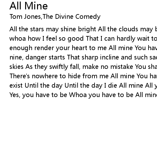 | All the stars may shine bright All the clouds may be white But when you smile whoa how I feel so good That I can hardly wait to hold you Enfold you; never enough render your heart to me All mine You have to be From that cloud, number nine, danger starts That sharp incline and such sad regrets Oh as these starry skies As they swiftly fall, make no mistake You shant escape, tethered and tied There's nowhere to hide from me All mine You have to be So don't resist We shall exist Until the day Until the day I die All mine All you have to be All mine Yes, you have to be Whoa you have to be All mine |