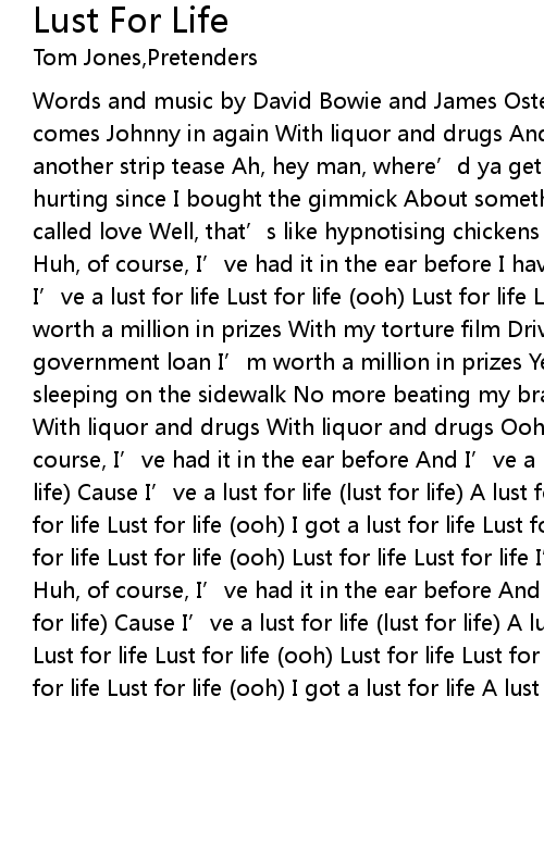 | Words and music by David Bowie and James Osterberg Lust for life x 3 Here comes Johnny in again With liquor and drugs And a flash machine He' s gonna do another strip tease Ah, hey man, where' d ya get that lotion? I' ve been hurting since I bought the gimmick About something called love Yeah, something called love Well, that' s like hypnotising chickens I' m just a modern guy Huh, of course, I' ve had it in the ear before I have a lust for life Cause I' ve a lust for life Lust for life ooh Lust for life Lust for life I' m worth a million in prizes With my torture film Drive a GTO I wear a uniform On a government loan I' m worth a million in prizes Yeah, I' m through with sleeping on the sidewalk No more beating my brains No more beating my brains With liquor and drugs With liquor and drugs Ooh, I' m just a modern guy Huh, of course, I' ve had it in the ear before And I' ve a lust for life lust for life Cause I' ve a lust for life lust for life A lust for life ooh A lust for life Lust for life ooh I got a lust for life Lust for life ooh Ah a lust for life Lust for life ooh Lust for life Lust for life I' m just a modern guy Huh, of course, I' ve had it in the ear before And I' ve a lust for life lust for life Cause I' ve a lust for life lust for life A lust for life ooh Lust for life Lust for life ooh Lust for life Lust for life ooh I got a lust for life Lust for life ooh I got a lust for life A lust for life |