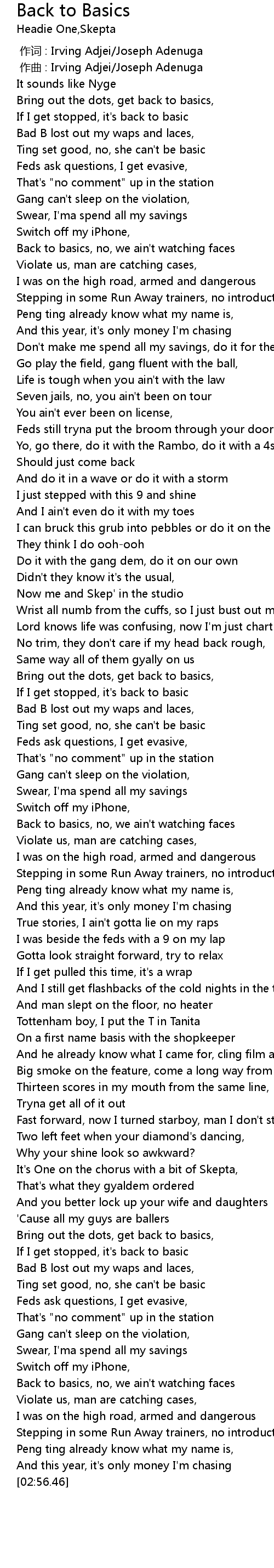 | [00:15.53] | If I get stopped, it's back to basic |
