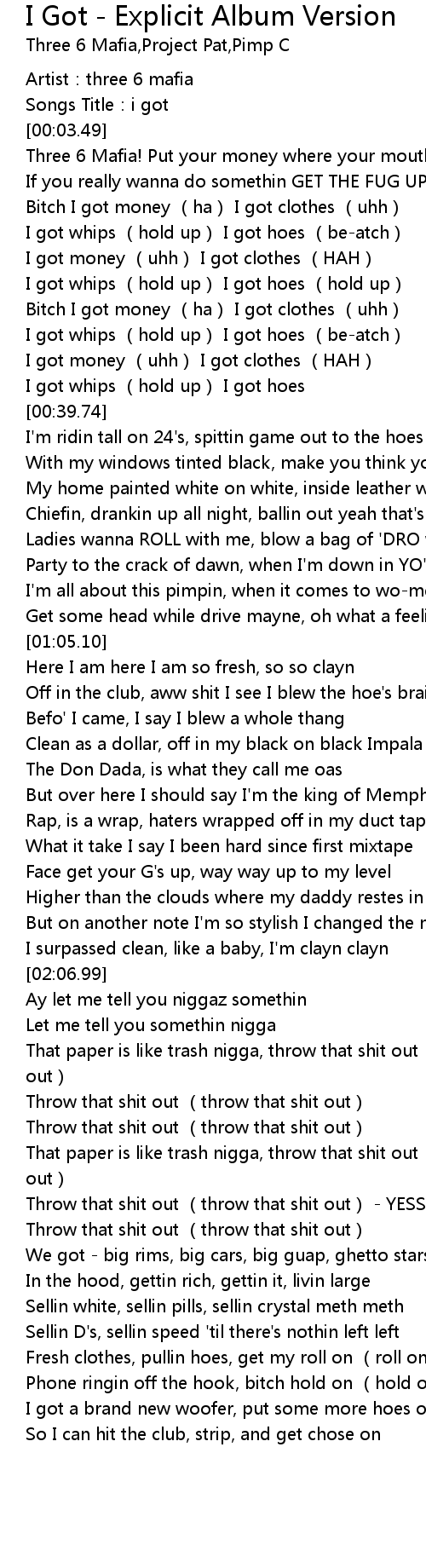 | [00:15.36] | Bitch I got money (ha) I got clothes (uhh) |