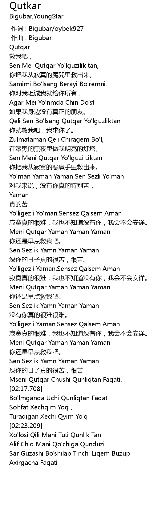 | [00:00.000] | zuo ci : Bigubar oybek927 |