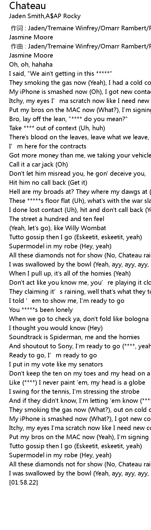 | [00:55.31] | All these diamonds not for show No, Chateau rain |