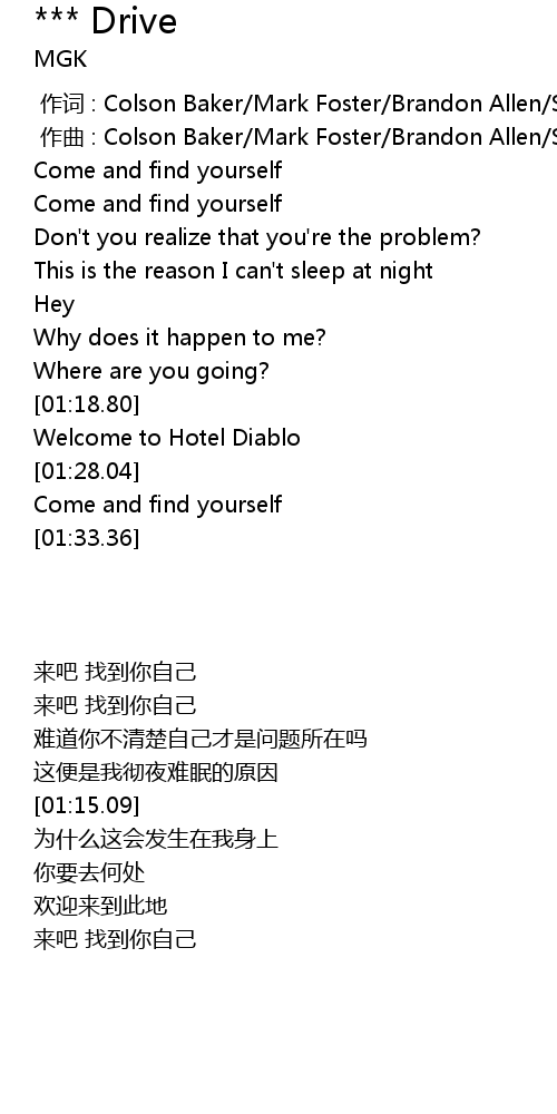 | [00:00.00] | 作词 : Colson Baker/Mark Foster/Brandon Allen/Stephen Basil |