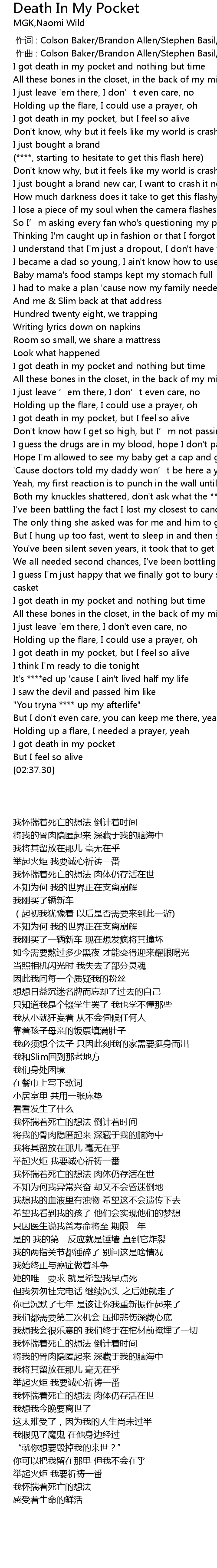 | [02:10.67] | I got death in my pocket, but I feel so alive |