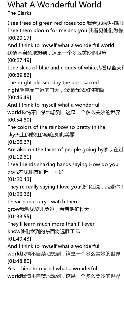| [01:53.31] | Yes I think to myself what a wonderful world wo qing bu zi jin di xiang dao, zhe shi yi ge duo me mei miao de shi jie |