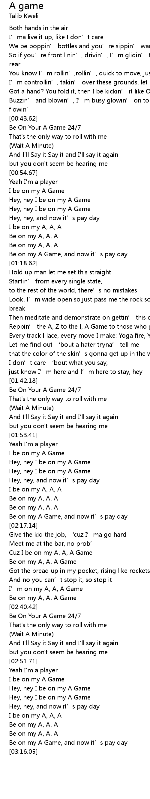 | [02:26.34] | Be on my A, A, A Game |