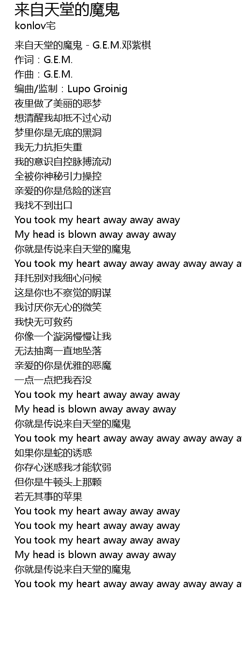 | [00:07.502] | 来自天堂的魔鬼 - G.E.M.邓紫棋 |
