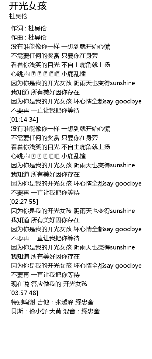 | [02:00.06] | 因为你是我的开光女孩 阴雨天也变得sunshine |