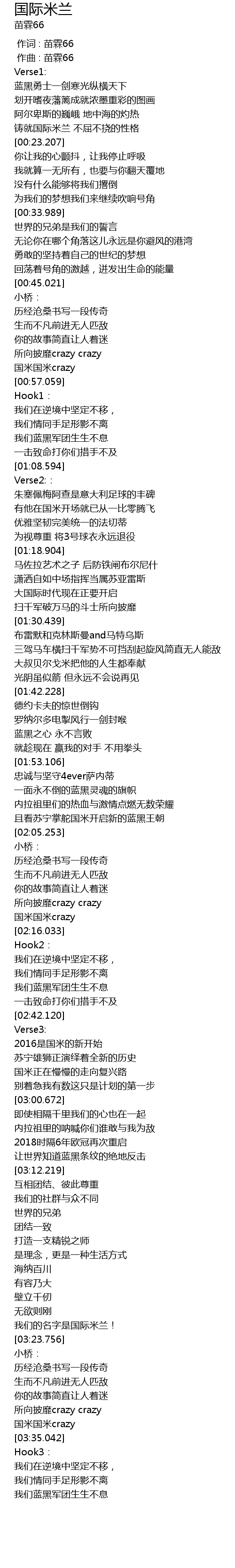 | [03:23.504] | wǒ men de míng zì shì guó jì mǐ lán! |