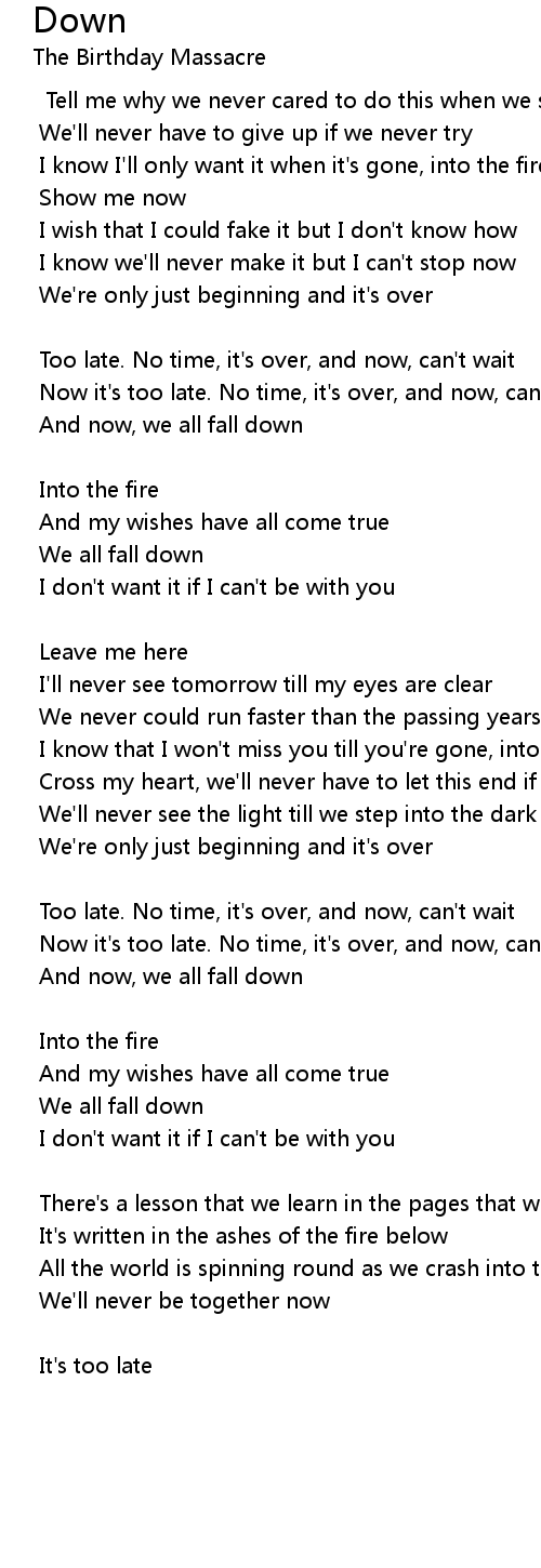 Too late. No time, it's over, and now, can't wait |