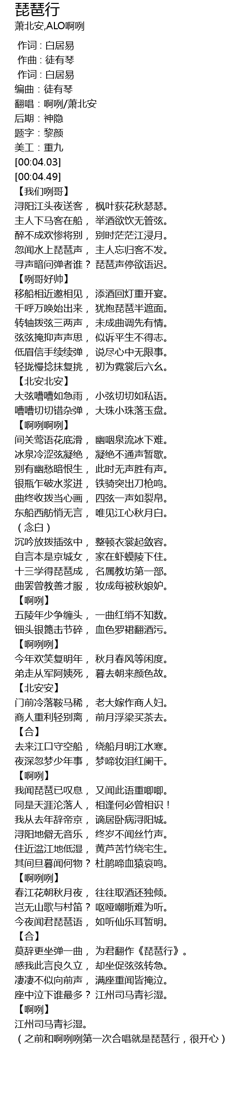 | [05:26.85] | (之前和啊咧咧第一次合唱就是琵琶行,很开心) |