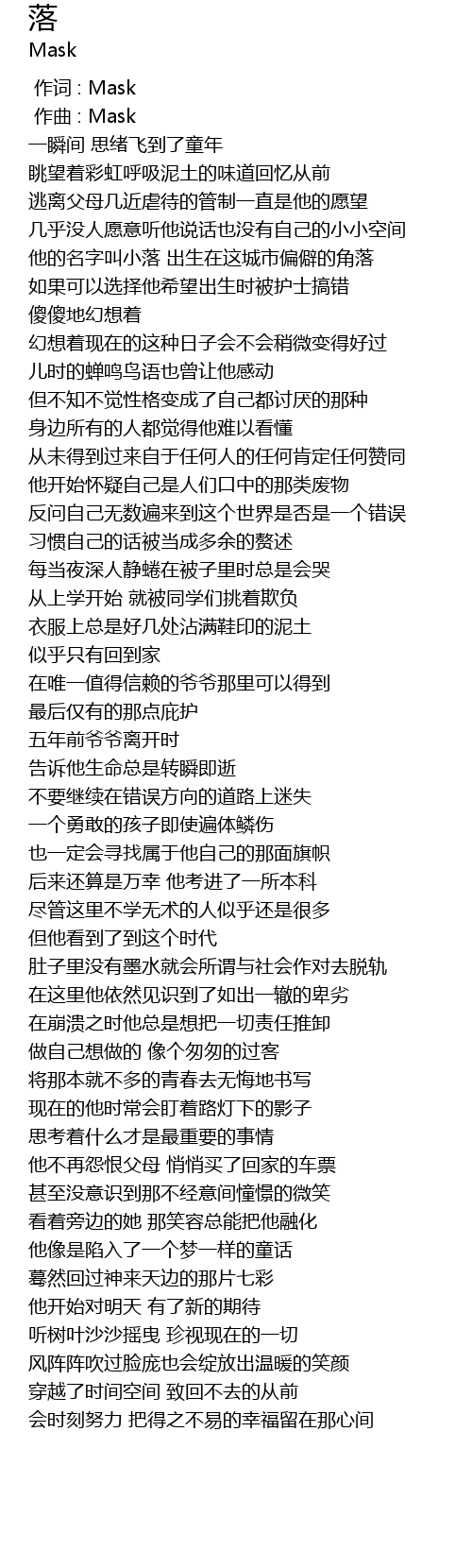 | [00:36.91] | 他的名字叫小落 出生在这城市偏僻的角落 |