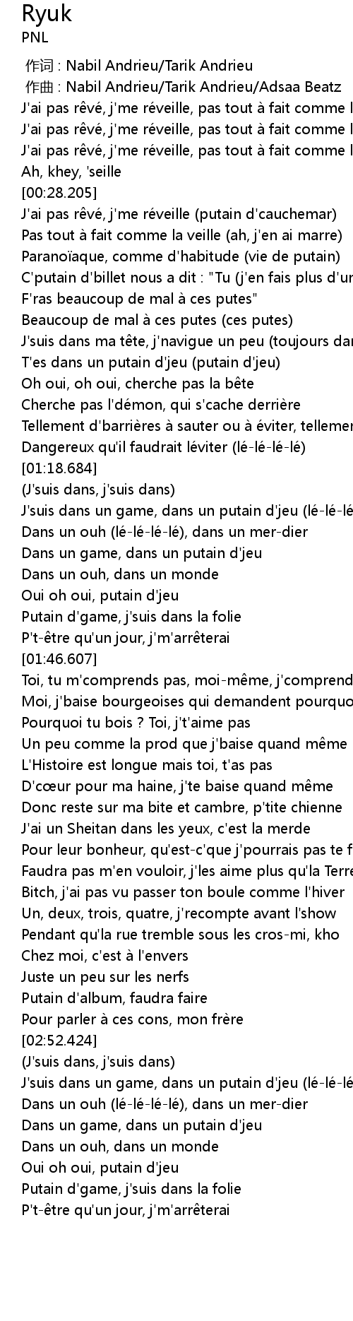 | [00:58.155] | T' es dans un putain d' jeu putain d' jeu |
