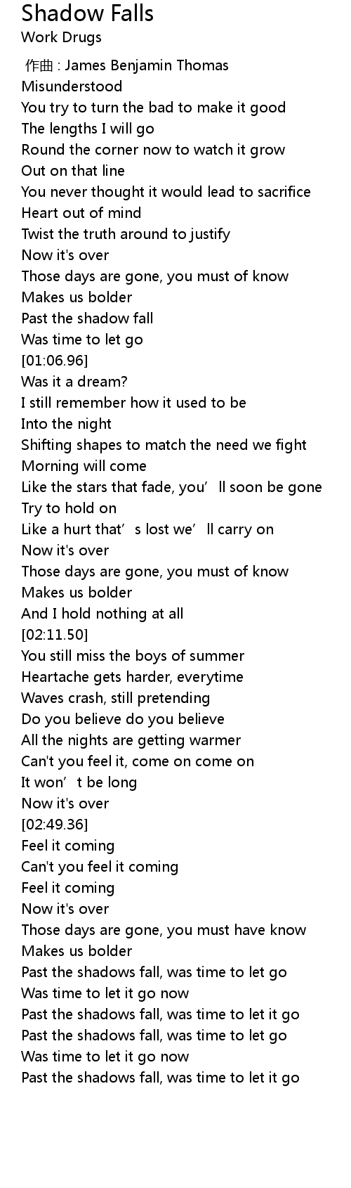 | [01:01.47] | Past the shadow fall |