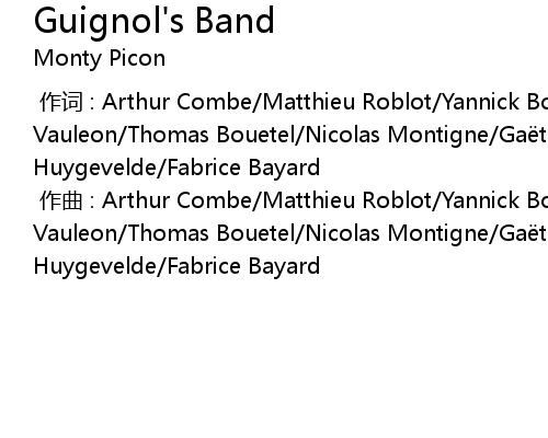 | [00:00.00-1] | zuò qǔ : Arthur Combe Matthieu Roblot Yannick Bordet Benjamin Vauleon Thomas Bouetel Nicolas Montigne Ga tan Bernard Lionel Priser Gurvan Huygevelde Fabrice Bayard |