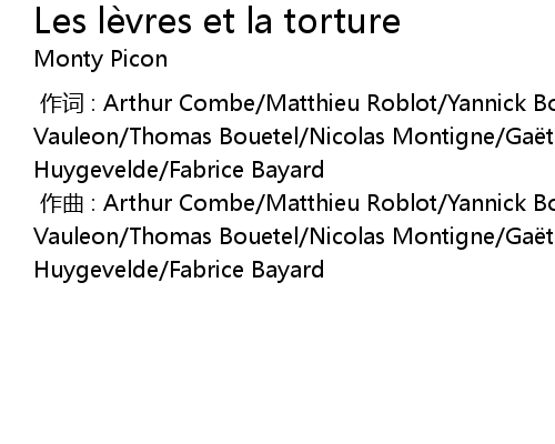 | [00:00.00-1] | zuò qǔ : Arthur Combe Matthieu Roblot Yannick Bordet Benjamin Vauleon Thomas Bouetel Nicolas Montigne Ga tan Bernard Lionel Priser Gurvan Huygevelde Fabrice Bayard |