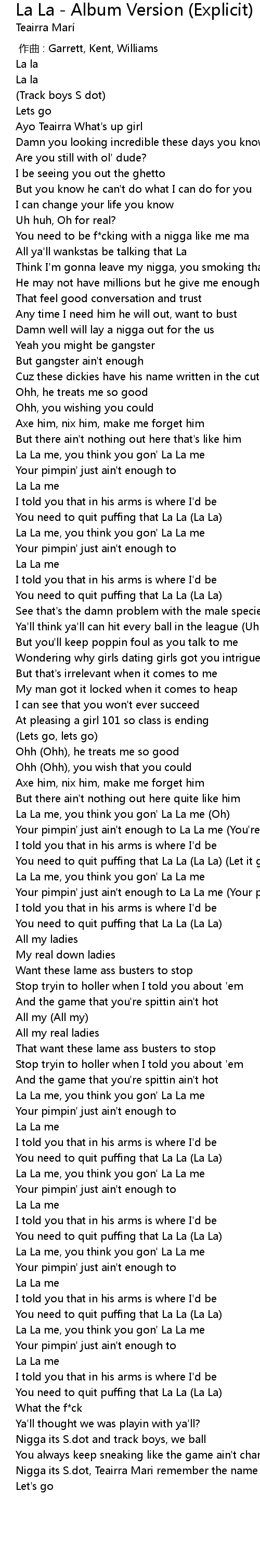 | [03:31.0] | Nigga its S. dot, Teairra Mari remember the name |
