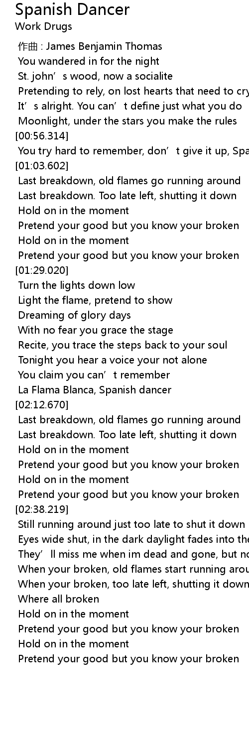 | [00:56.812] | You try hard to remember, don’t give it up, Spanish dancer |