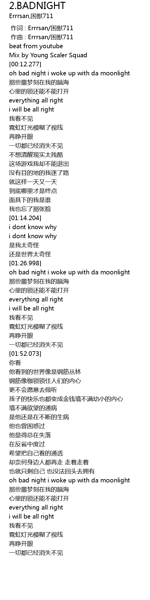 | [00:00.000] | 作词 : Errrsan/困獣711 |