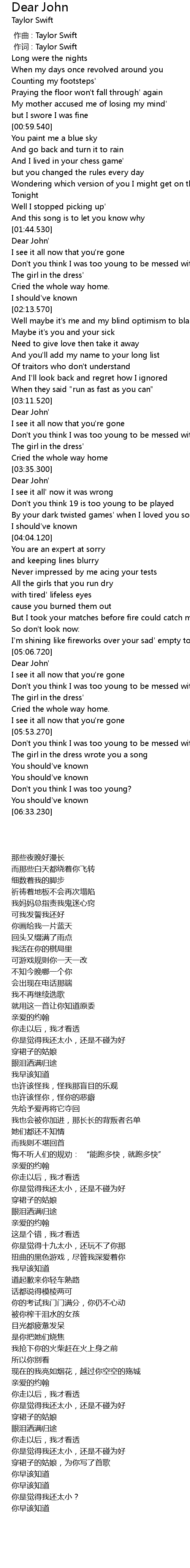 | [00:01.00] | 作词 : Taylor Swift |