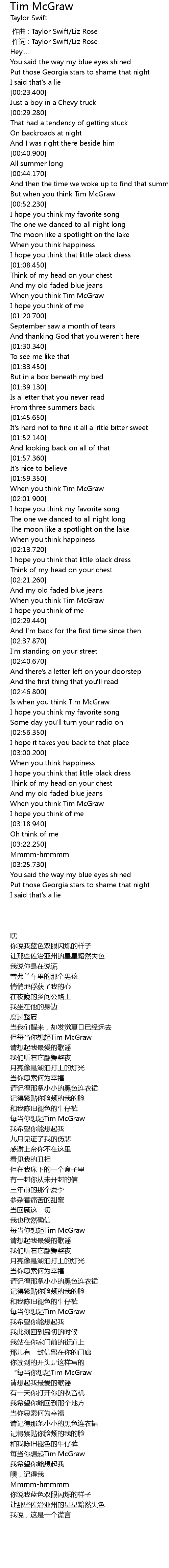 | [00:01.00] | 作词 : Taylor Swift/Liz Rose |