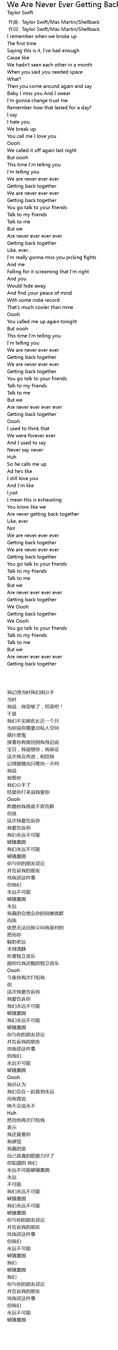 | [00:01.00] | 作词 : Taylor Swift/Max Martin/Shellback |