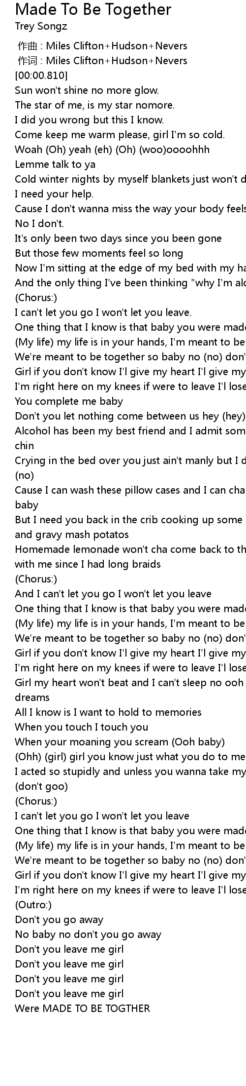 | [01:16.780] | We' re meant to be together so baby no no don' t don' t go Oh |
