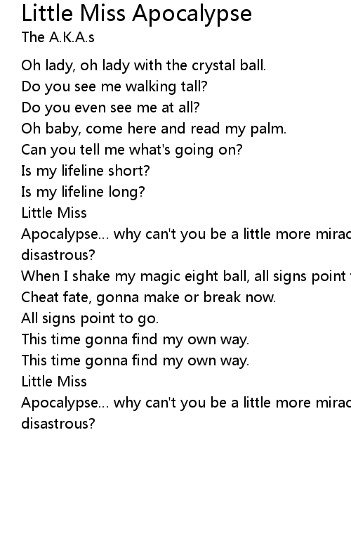 | Apocalypse why can' t you be a little more miraculous a little less disastrous? |