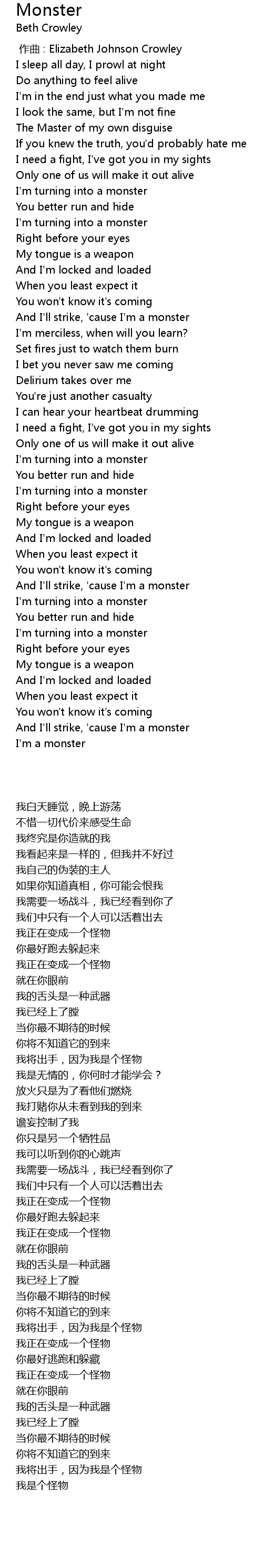| [01:13.978] | And I' ll strike, ' cause I' m a monster |