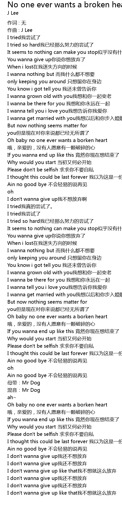 | Oh baby no one ever wants a borken heart ó, qīn ài de, méi yǒu rén yuàn yì yǒu yī kē pò suì de xīn | |