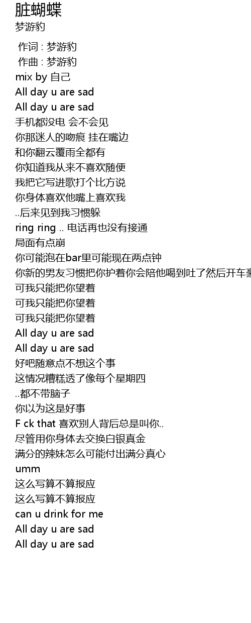 | [01:49.153] | F ck that xǐ huān bié rén bèi hòu zǒng shì jiào nǐ.. |