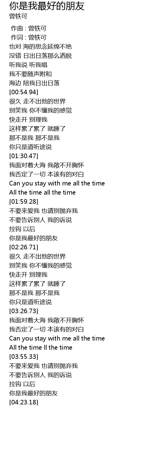 | [02:22.39] | nǐ shì wǒ zuì hǎo de péng yǒu |