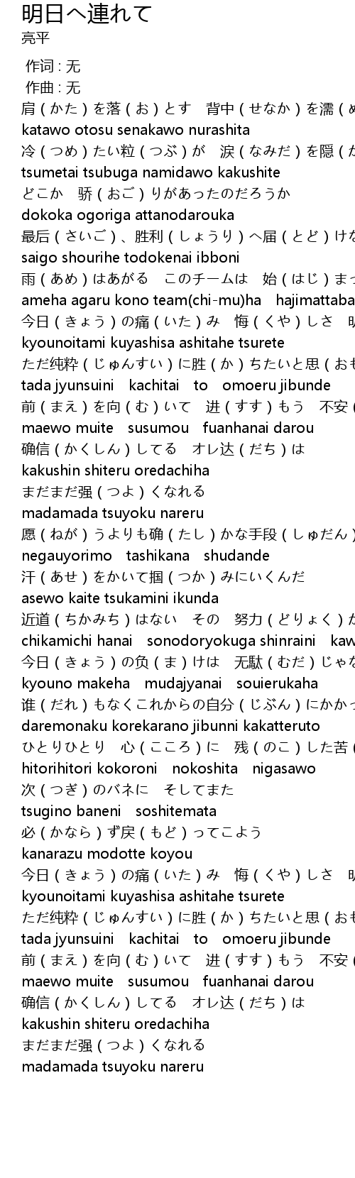 | [01:09.938] | 今日(きょう)の痛(いた)み 悔(くや)しさ 明日(あした)へ连(つ)れて |