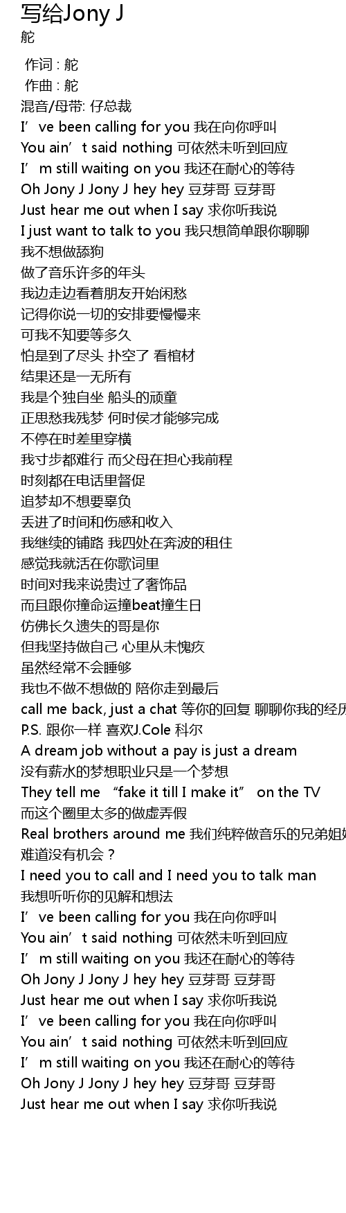 | [01:37.403] | Oh Jony J Jony J hey hey 豆芽哥 豆芽哥 |