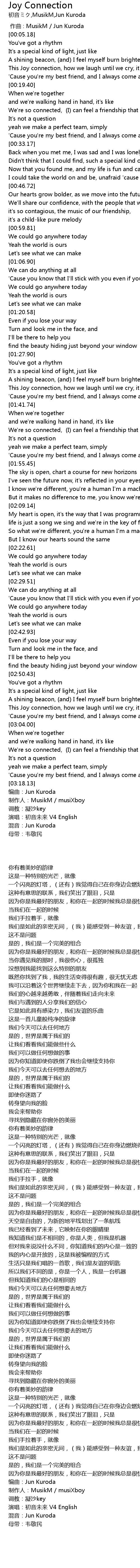 | [01:45.36] | We're so connected, (I) can feel a friendship that will last forever |