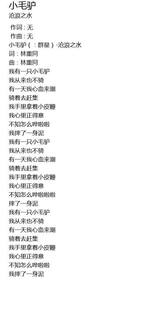 | [00:00.00] | 小毛驴(:群星)-沧浪之水 |