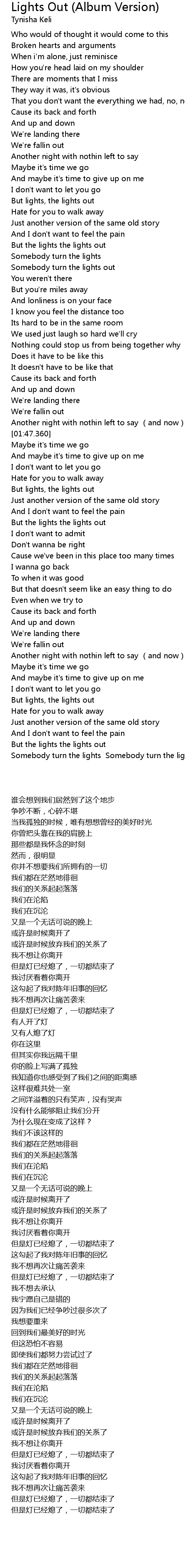 | [03:12.570] | Somebody turn the lights Somebody turn the lights out |