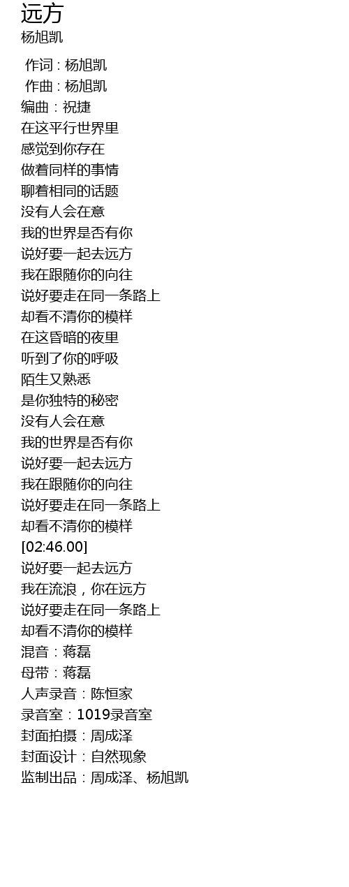 | [00:01.00] | 作曲 : 杨旭凯 |