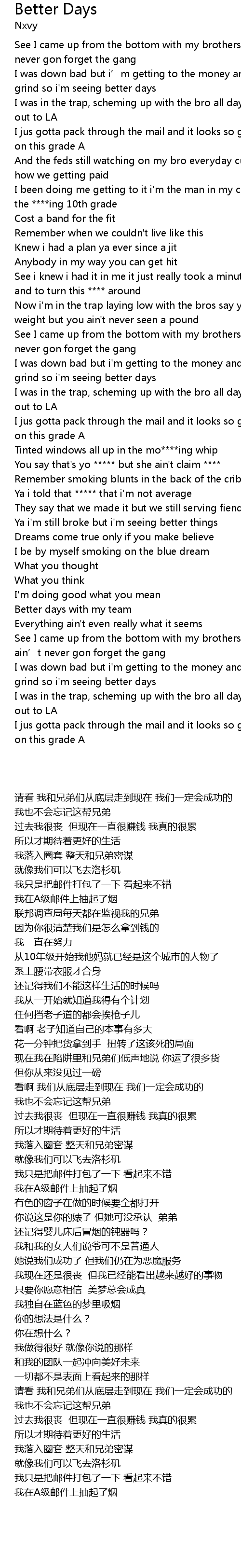| [01:58.000] | I was down bad but i' m getting to the money and i' m really on my grind so i' m seeing better days |