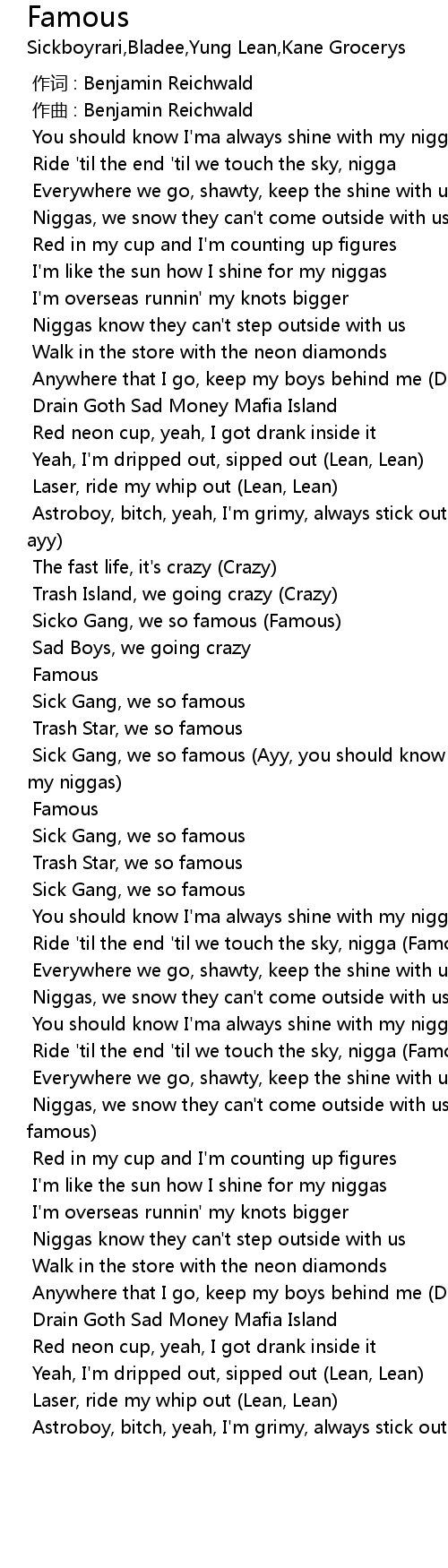 | [01:19.487] | Sick Gang, we so famous Ayy, you should know I' ma always shine with my niggas |
