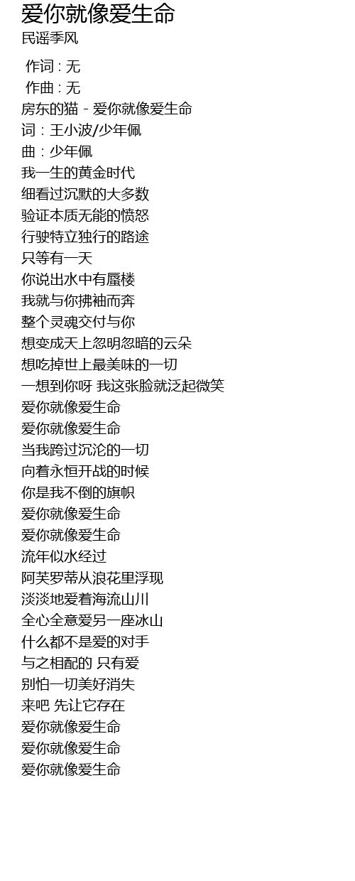 | [00:02.949] | 房东的猫 - 爱你就像爱生命 |