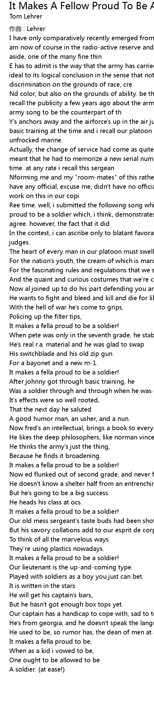 | Ree time. well, i submitted the following song which is called it makes a fellow proud to be a soldier which, i think, demonstrates the proper spirit you' ll agree. however, the fact that it did | |