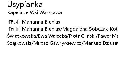 | [00:00.00-1] | zuò qǔ : Marianna Bienias Magdalena SobczakKotnarowska Sylwia wi tkowska Ewa Wa ecka Piotr Gli ski Pawe Mazurczak Maciej Szajkowski Mi osz Gawry kiewicz Mariusz Dziurawiec |