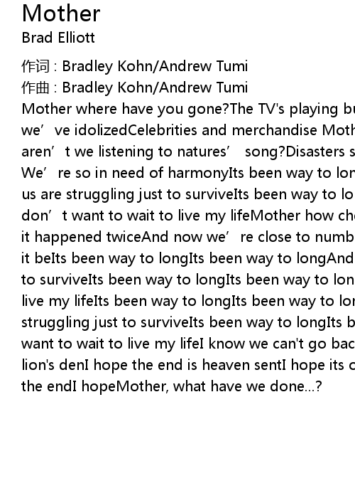 | Mother where have you gone? The TV' s playing but nothings onWe' ve lost our way, we' ve idolizedCelebrities and merchandise Mother what' s going on? Why aren' t we listening to natures' song? Disasters strike, still we don' t see We' re so in need of harmonyIts been way to longIts been way to longAnd most of us are struggling just to surviveIts been way to longIts been way to long And I don' t want to wait to live my lifeMother how cheap is life? Not one great war, it happened twiceAnd now we' re close to number threeI wonder when we' ll let it beIts been way to longIts been way to longAnd most of us are struggling just to surviveIts been way to longIts been way to long And I don' t want to wait to live my lifeIts been way to longIts been way to longAnd most of us are struggling just to surviveIts been way to longIts been way to long And I don' t want to wait to live my lifeI know we can' t go back againI know we' re in the lion' s denI hope the end is heaven sentI hope its ok in the endI hope its ok in the endI hopeMother, what have we done...? |