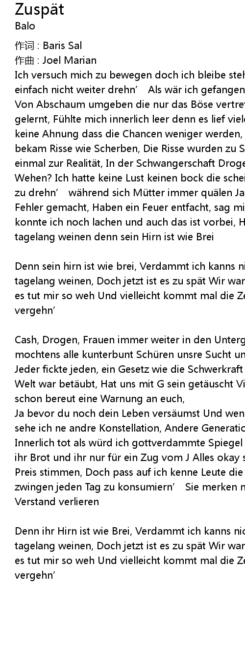 | Ich versuch mich zu bewegen doch ich bleibe stehn' Als wü rd sich der Zeiger einfach nicht weiter drehn' Als w r ich gefangen in diesem sinnlosen Leben, Von Abschaum umgeben die nur das B se vertreten Ich hab in meinem Leben vieles gelernt, Fü hlte mich innerlich leer denn es lief vieles verkehrt Ich hatte keine Ahnung dass die Chancen weniger werden, Ich sah den Teufel auf Erden und bekam Risse wie Scherben, Die Risse wurden zu Scherben Gangsterfilme wurden auf einmal zur Realit t, In der Schwangerschaft Drogen, wieso aufh ren in den Wehen? Ich hatte keine Lust keinen bock die scheisse zu erleben, Meine Joints' zu drehn' w hrend sich Mü tter immer qu len Ja wir warn im Elend haben Fehler gemacht, Haben ein Feuer entfacht, sag mir was hat es gebracht? Damals konnte ich noch lachen und auch das ist vorbei, Heute k nnt ich nur noch tagelang weinen denn sein Hirn ist wie Brei | |