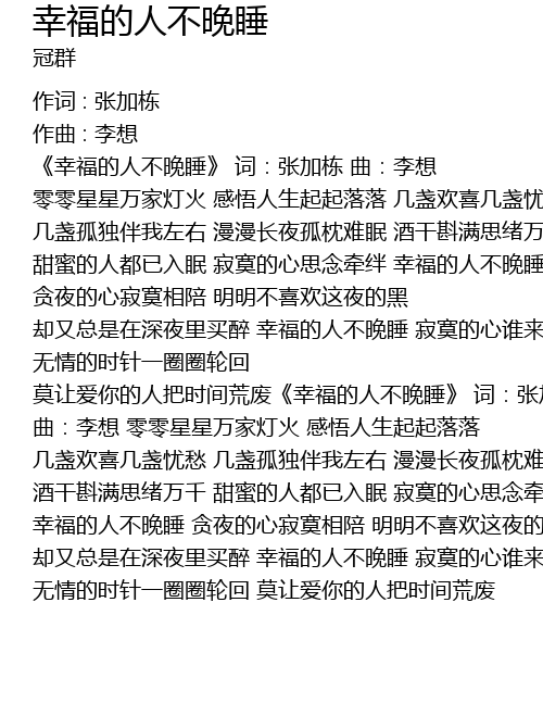 | 《幸福的人不晚睡》 词:张加栋 曲:李想 零零星星万家灯火 感悟人生起起落落 几盏欢喜几盏忧愁 几盏孤独伴我左右 漫漫长夜孤枕难眠 酒干斟满思绪万千 甜蜜的人都已入眠 寂寞的心思念牵绊 幸福的人不晚睡 贪夜的心寂寞相陪 明明不喜欢这夜的黑 却又总是在深夜里买醉 幸福的人不晚睡 寂寞的心谁来陪 无情的时针一圈圈轮回 莫让爱你的人把时间荒废《幸福的人不晚睡》 词:张加栋 曲:李想 零零星星万家灯火 感悟人生起起落落 几盏欢喜几盏忧愁 几盏孤独伴我左右 漫漫长夜孤枕难眠 酒干斟满思绪万千 甜蜜的人都已入眠 寂寞的心思念牵绊 幸福的人不晚睡 贪夜的心寂寞相陪 明明不喜欢这夜的黑 却又总是在深夜里买醉 幸福的人不晚睡 寂寞的心谁来陪 无情的时针一圈圈轮回 莫让爱你的人把时间荒废 |